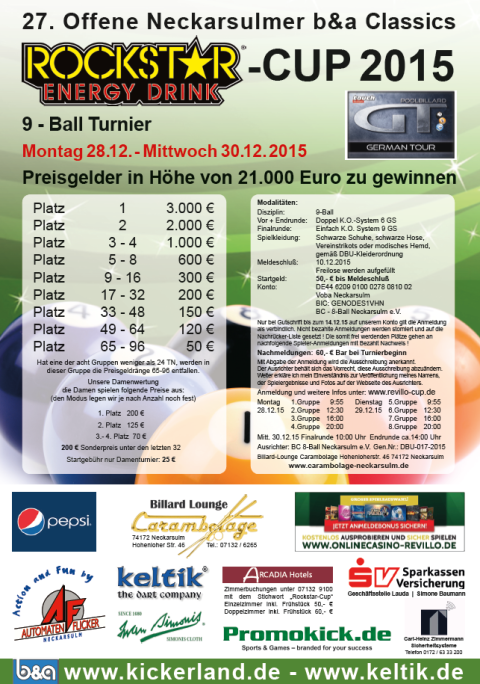 Can Salim vom PBC Joker Kamp-Lintfort hat ein wenig überraschend die 2015er Auflage des b&a classics „Rockstar Cup“ in Neckarsulm gewonnen und wertvolle Punkte im German Tour-Ranking gesammelt. Der ehemalige Bundesligaspieler des PBC Schwerte setzte sich in dem mit 256 Teilnehmern vollbesetzten Feld gegen die versammelte Konkurrenz durch. Im Finale behielt er mit 9:4 deutlich die Oberhand gegen den Kroaten Ivica Putnik Nur ein Spielgewinn mehr war im Halbfinale Niels Feijen gelungen, doch stoppen konnte auch er den Youngster nicht. Parallel schaltete Putnik Sascha Jülichmanns vom PBC Neuwerk mit 9:1 aus. Nichts mit dem Ausgang des Turniers hatten unter anderem so namhafte Spieler wie Oliver Ortmann, Joshua Filler, Mateusz Sniegocki und viele andere zu tun. (Bericht von Touch German Tours)