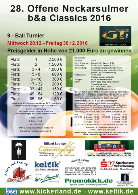 In einem bis zum 5:5 sehr spannenden Finale setzte sich Filler gegen den Straubinger Benjamin Baier mit 9:5 durch. Dieser wiederum hatte in seinem Halbfinale die Hoffnungen von Ralf Souquet auf einen erneut Triumph in Neckarsulm zunichte gemacht. Der Dachauer hatte einst das Turnier in Serie gewonnen und war erstmals seit Jahren wieder am Start. Ebenfalls Dritter wurde Valery Kuloyants (BSV Fürstenfeldbruck), der damit zum Jahresabschluss sein bestes Turnierresultat 2016 feierte.